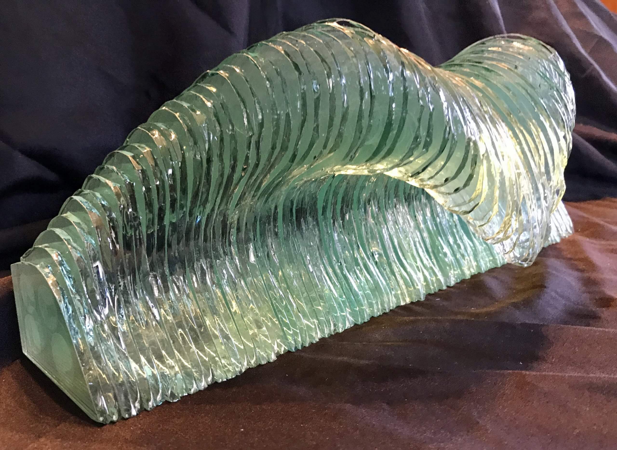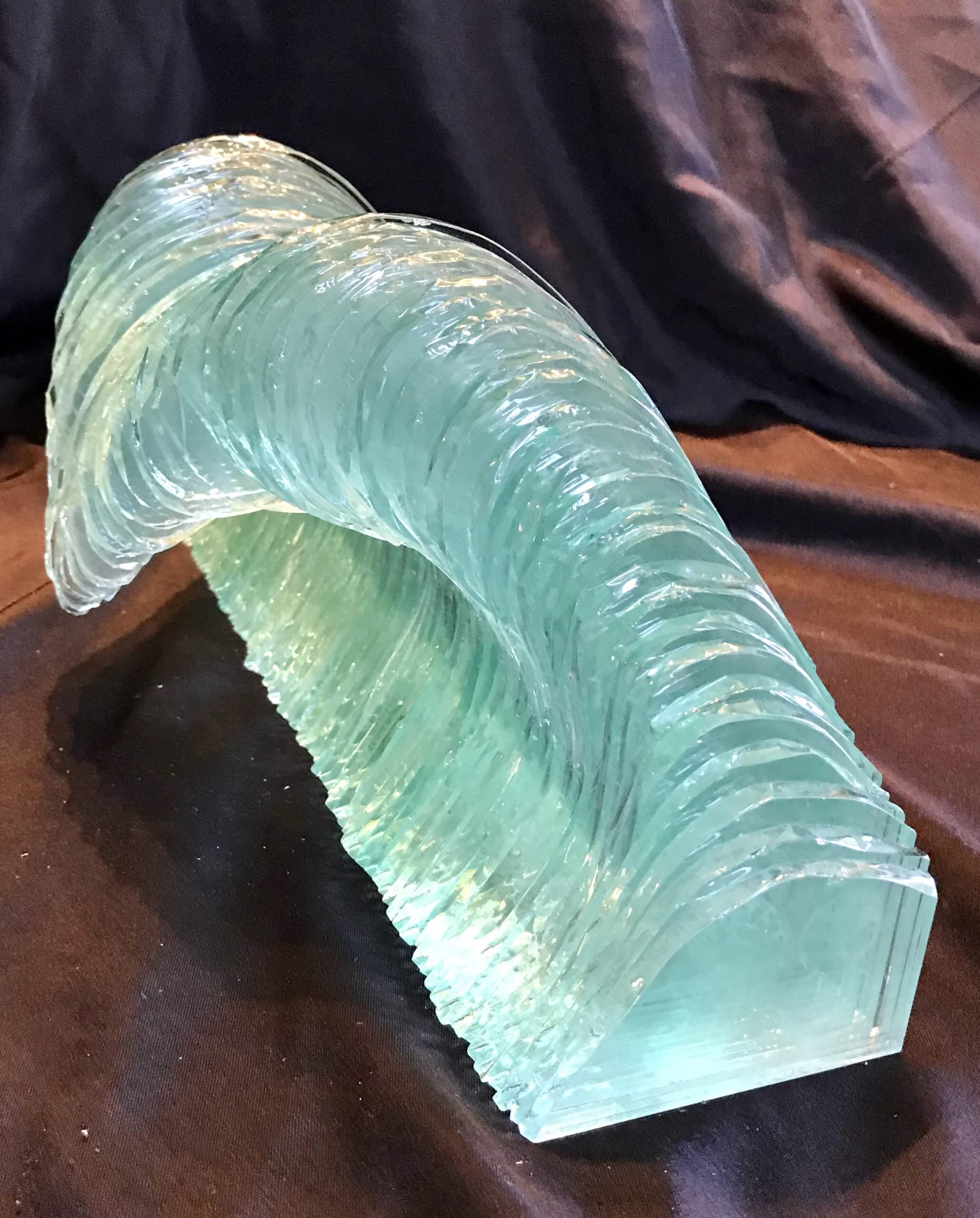 Recycled car glass cut and fused together to create ocean wave glass tube sculpture.