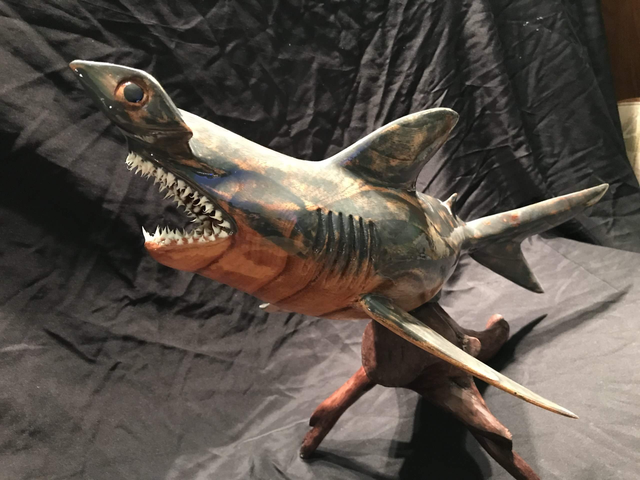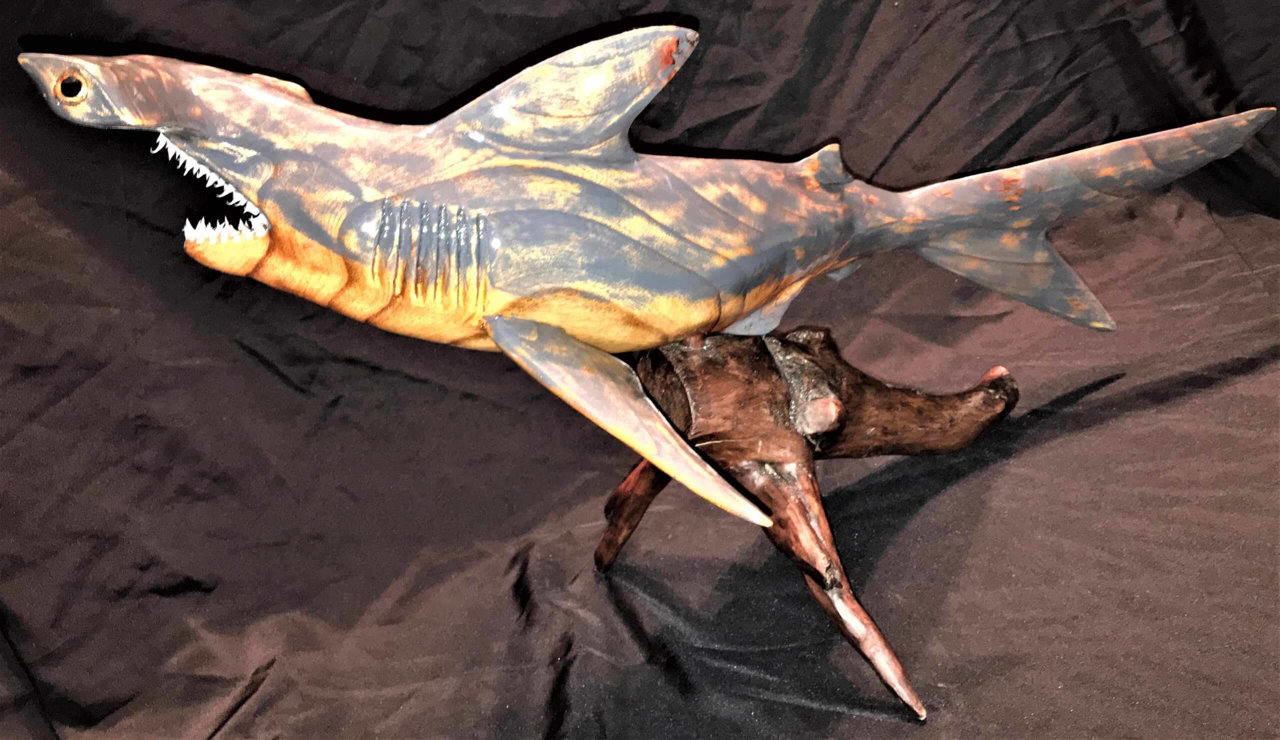 Hammer Head Wood Shark Carving/Sculpture created by award winning artist Douglas Snider at Snidely Wood Studio. No one make it look so real.